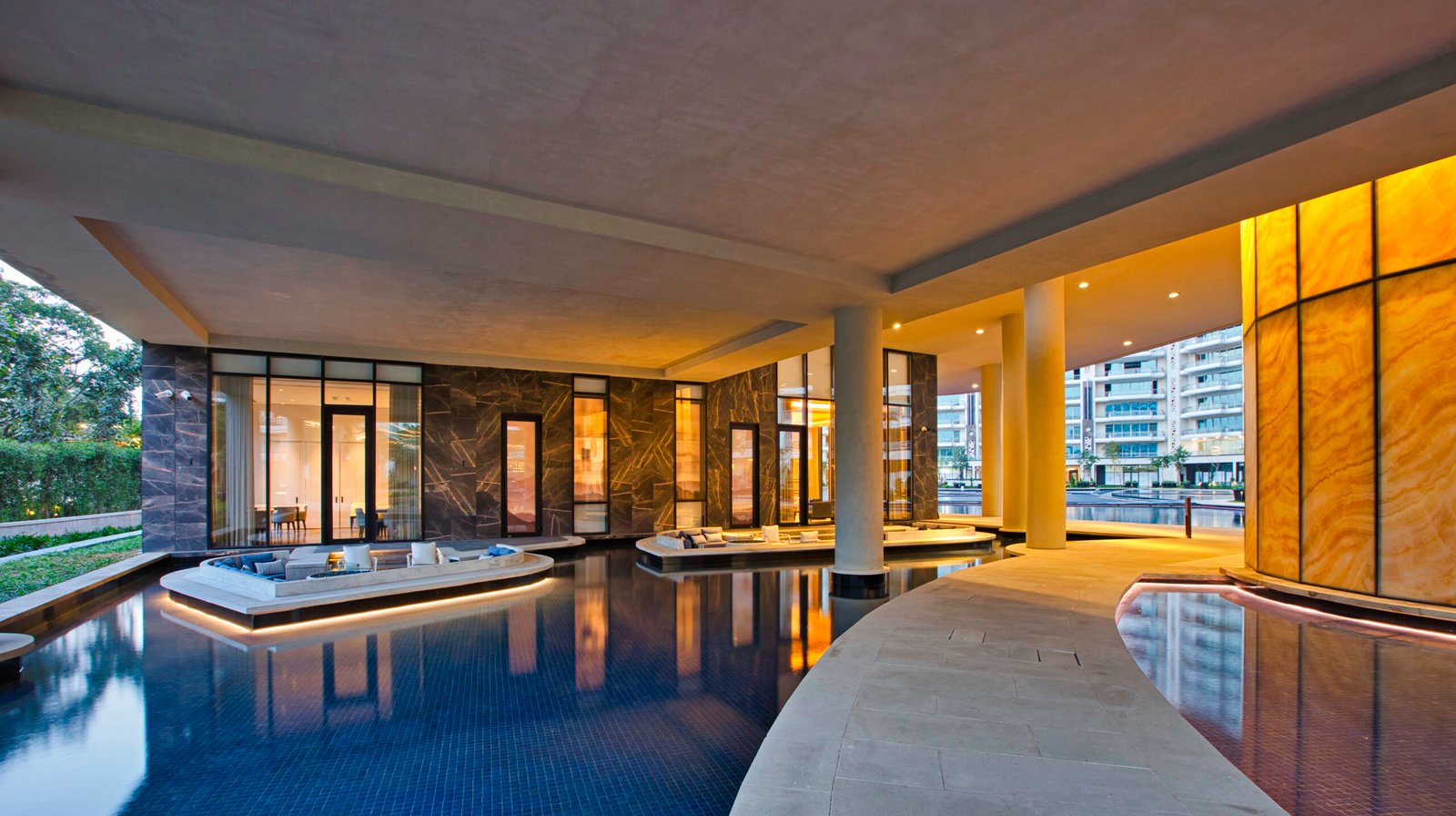 Adjacent to the Banquet Hall is the Restaurant, a fine dining space that seamlessly combines gastronomy with aesthetics. Overlooking a large internal courtyard, the restaurant offers dramatic views of the Club House and the Gym, creating a vibrant yet relaxing ambience. Its thoughtful design ensures a mix of openness and intimacy, catering to both casual diners and those seeking a more private dining experience.The interiors of the restaurant are a harmonious blend of modernity and comfort, with earthy tones, ambient lighting, and sleek furnishings. A highlight of the space is its Bar, which serves an array of premium beverages, making it an ideal spot for socialising or unwinding after a long day.